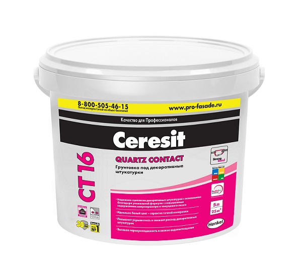 Назначение грунтующего состава CT 16 — подготовка поверхностей к нанесению декоративных штукатурок. Используется как во внутренних помещениях, так и при обработке фасадов. Грунтовка подходит практически для всех видов оснований: от гипсокартона и бетона до древесностружечных панелей и цементно-песчаных штукатурных смесей. Она обеспечивает отличный результат на прочных лакокрасочных покрытиях, гипсовых поверхностях и цементно-известковых основаниях. Также применяется в качестве базовой защиты фасадов в наружных теплоизоляционных системах Ceresit VWS и WM.